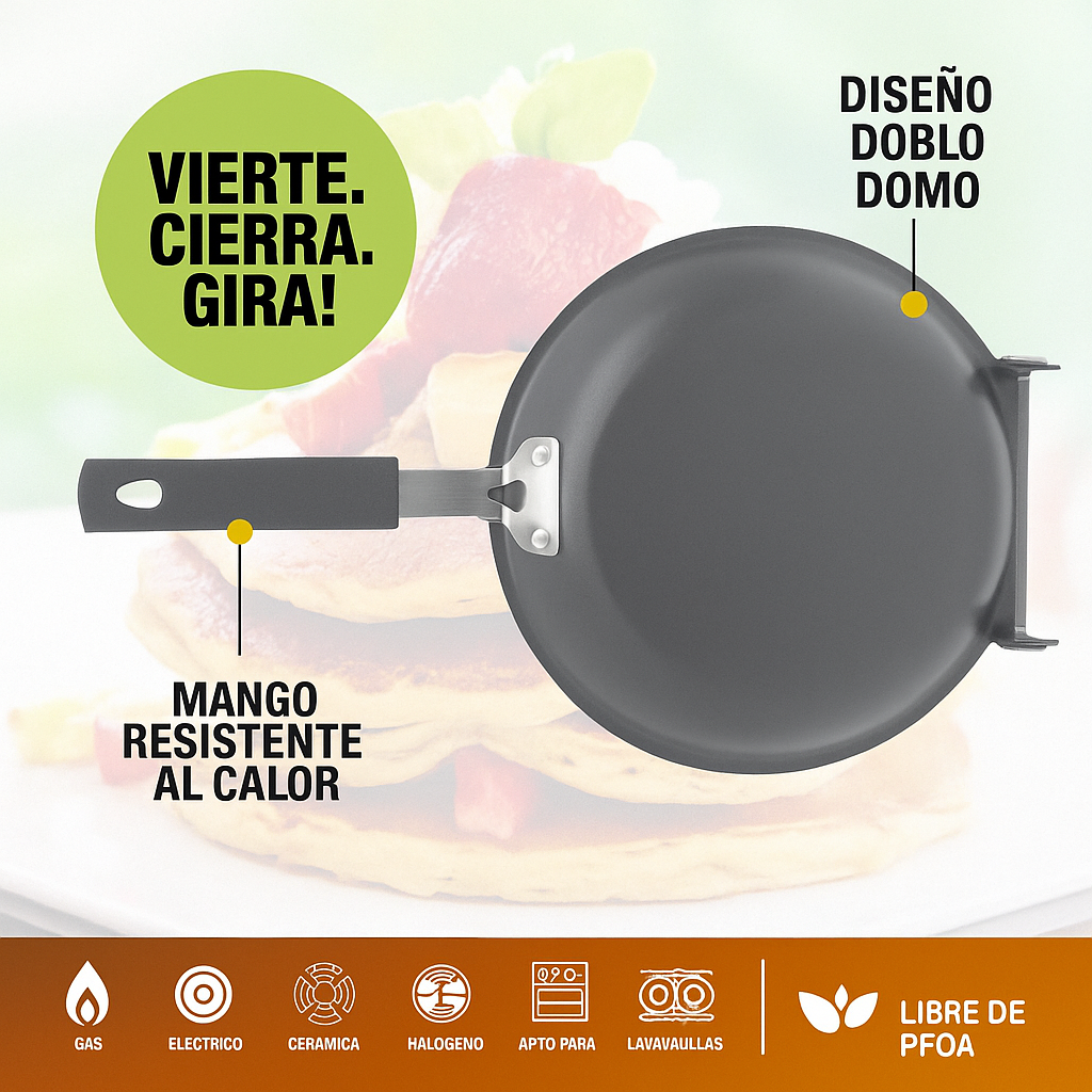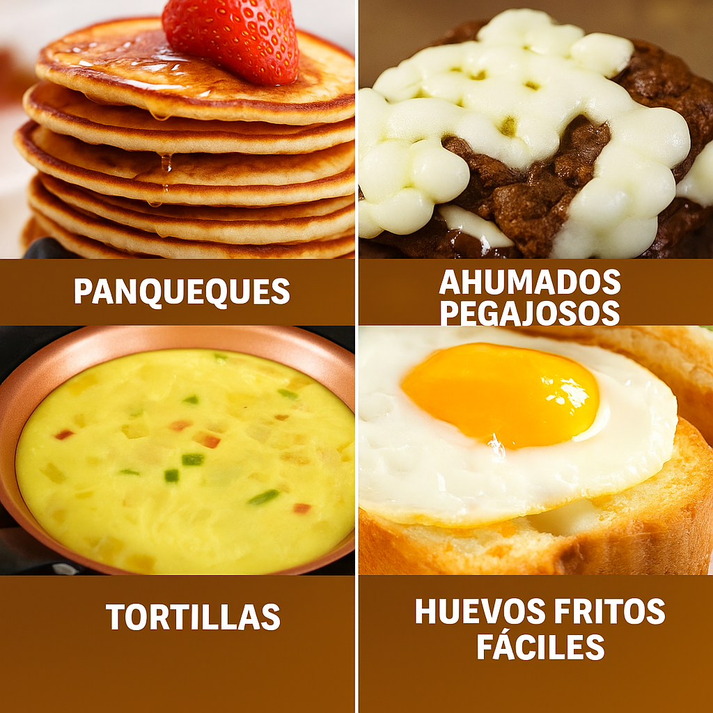 ✨ Imagina preparar en minutos unos panqueques doraditos, una tortilla jugosa y bien rellena, o unas crepas dulces irresistibles, todo en un mismo sartén y sin que nada se quede pegado.